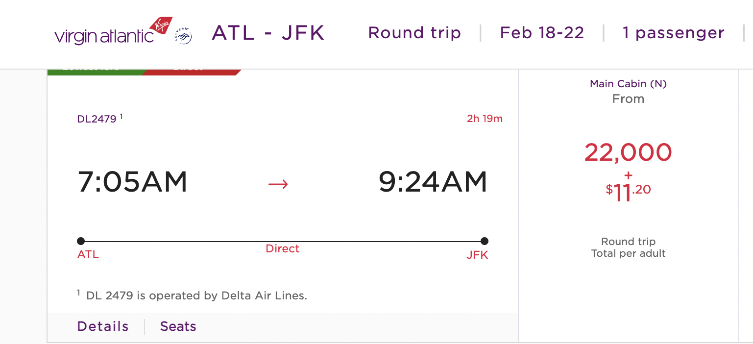 However, making the same booking in the same class will cost $11 with 22,000 points. This is a significant amount of saving in comparison to directly booking through Delta Airlines or any other travel agency. However, this is excluding the actual value of the points used (22,000).