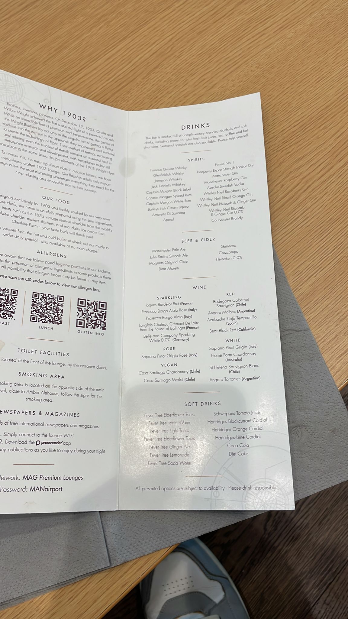 The drinks menu was very impressive including soft drinks, spirits , beer and wine. The drinks are noted on a menu which is rare in lounges! Please find the menu attached in the image block at the beginning of the review!
